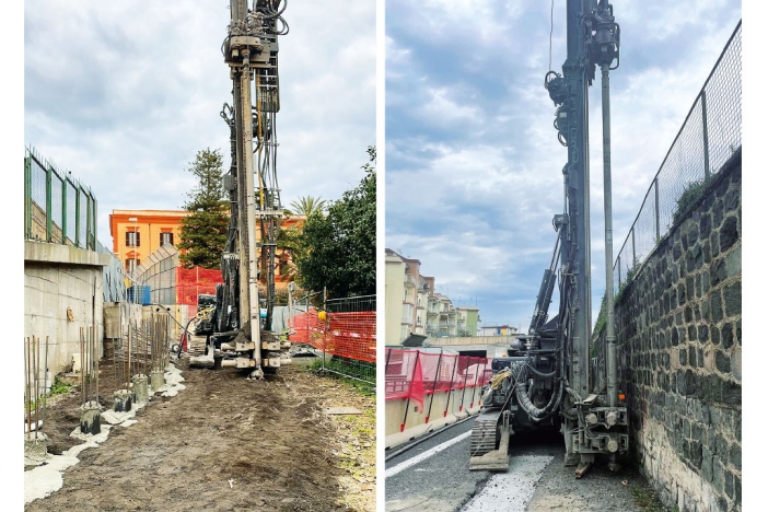 Ponte ideale e ponte fisico, per il quale, come ci spiega sempre Dello Margio: “A inizio 2025 ci siamo occupati di realizzare 16 pali di grande diametro, 8 per ogni spalla, con diametro 1.500 mm a 43 m di profondità, mentre da quasi un mese siamo impegnati a realizzare 100 micropali a una profondità che varia da 6 ai 9 m. Di questi 100 i 26 sul lato Rotonda sono realizzati con il metodo classico, a pressione unica, mentre i 74 sul lato Antignano sono micropali valvolati, vale a dire che con la sola forza dell’acqua in pressione spingiamo via la sabbia e posiamo il rivestimento di acciaio da 300 mm di diametro dotato di valvole di non ritorno, per poi procedere con le iniezioni primarie, in cui la malta cementizia viene iniettata a bassa pressione nello spazio anulare tra il tubo d’armatura e le pareti del foro, così da formare una guaina e impedire il riflusso delle miscele iniettate successivamente. Difatti, dopo l’indurimento della guaina, si eseguono iniezioni ad alta pressione attraverso le valvole che aumentano l’aderenza e la capacità portante del palo. La presenza di valvole – specifica – permette di ripetere le iniezioni ad alta pressione in successione, al fine di ottimizzare il consolidamento”.
