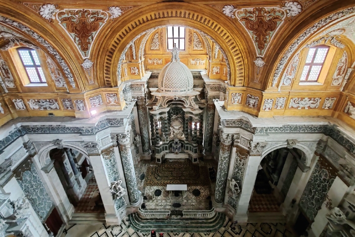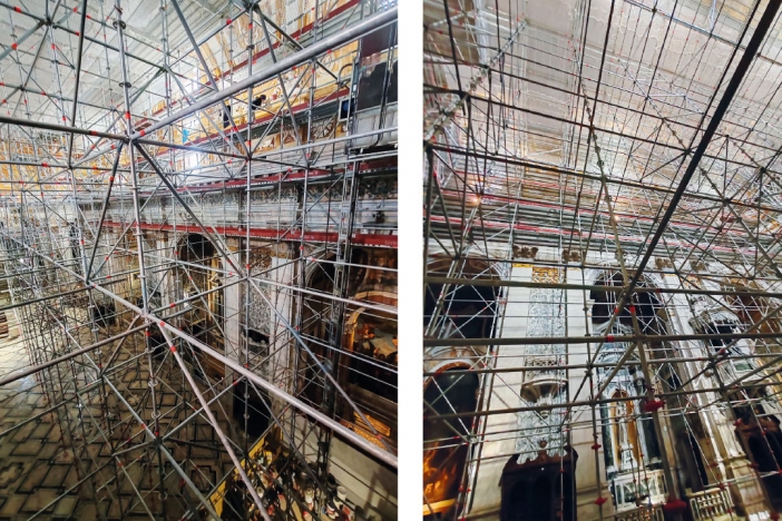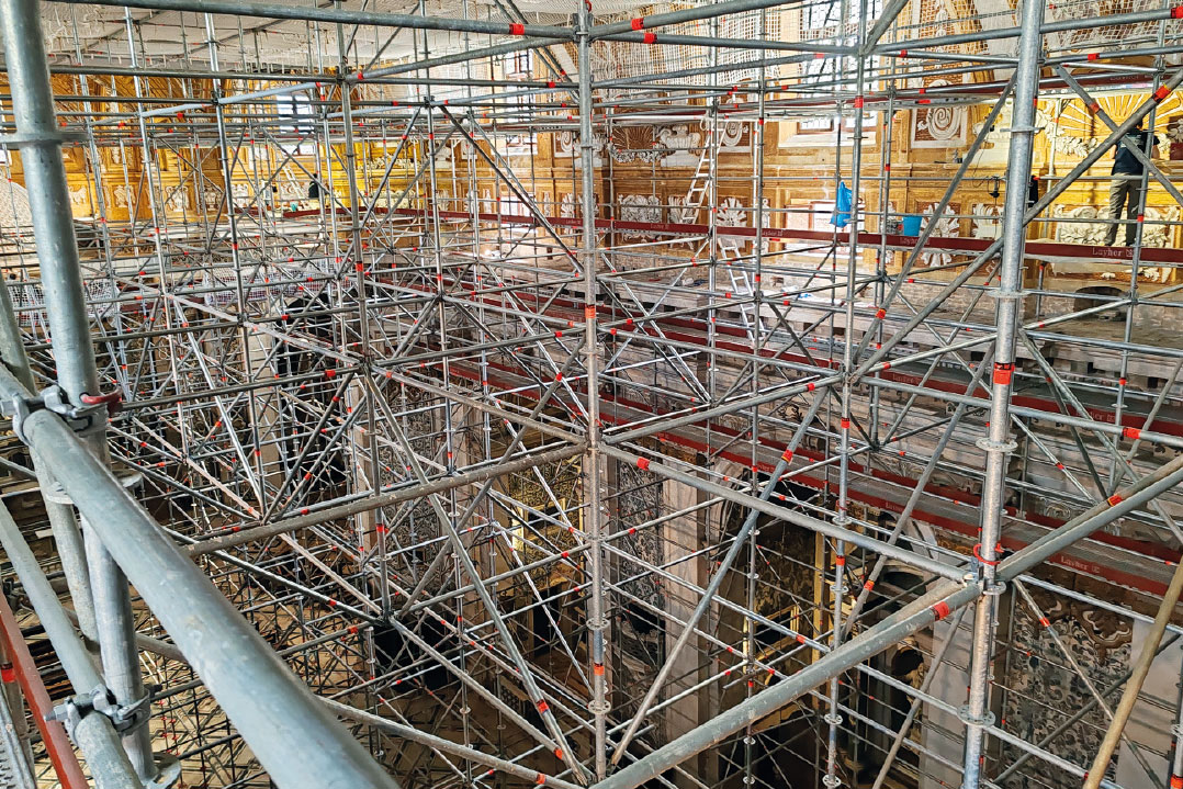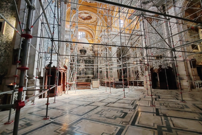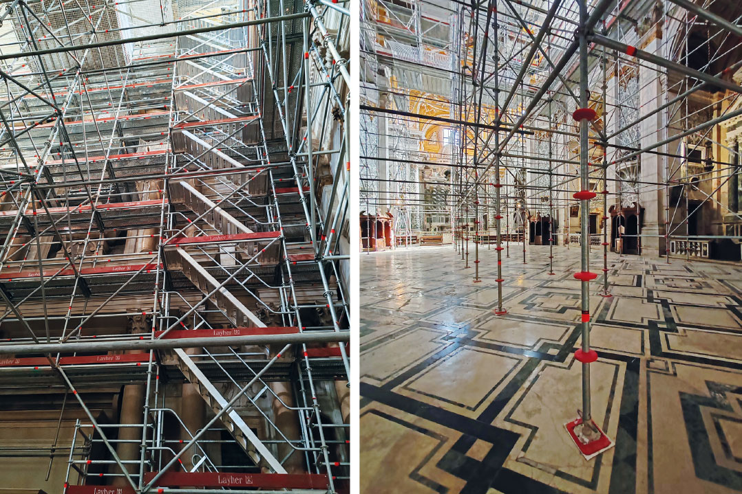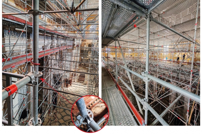 La possibilità di tenere aperta la chiesa, dall'inizio del cantiere, quindi ottobre 2024 fino al 30 aprile 2026, data prevista di fine lavori, è senz'altro un plus reso possibile dal sistema provvisionale Layher. Come ci spiega Andrea Piovesan, Sviluppo Tecnico Commerciale di Layher Spa: "Se avessimo affrontato questo cantiere quarant'anni fa, avremmo dovuto riempire il volume della chiesa di tubo e giunto, oggi invece abbiamo potuto sfruttare la tecnologia Layher per utilizzare un sesto in meno del materiale, che si traduce anche in un sesto in meno del peso che grava sul pavimento, un pavimento irregolare vista l'ovvia mancanza di fondazioni, ma soprattutto un pavimento che ha l'assoluta necessità di essere preservato trattandosi di un pavimento in pietra d'Istria realizzato con tecnica mista di intarsio e commesso e con inserti di verde alpi e, nelle parti più pregiate, di verde antico. Grazie al sistema multidirezionale Allround - prosegue Piovesan - caratterizzato dall'assenza di giunzioni a bullone, possiamo collegare tra loro, ad angolo retto, i diversi elementi, ma possiamo anche orientarli a piacimento, garantendo sempre la trasmissione ottimale dei carichi. Obiettivo primario per questo lavoro - specifica - era la realizzazione di un ponteggio che, all'interno della chiesa, fosse leggero e il meno invasivo possibile. Con l'utilizzo del nostro sistema Allround e l'ausilio di elementi Allround LW (Light Weight) abbiamo diminuito il peso proprio della struttura, aumentandone allo stesso tempo la portata, potendo lavorare con campate di lunghezza maggiore: una soluzione che ha permesso di garantire un'ottima accessibilità alla base, minimizzando gli appoggi a terra per ridurre appunto le interferenze alla fruizione della chiesa stessa. Se all'esterno è stato realizzato un ponteggio per intervenire sia sulle facciate sia parzialmente sulla copertura, con l'inserimento di una torre scala a rampe in alluminio per garantire un accesso comodo e sicuro ai diversi piani di lavoro - conclude Piovesan - nella parte interna la piattaforma per poter intervenire su affreschi e sui soffitti è supportata da soli appoggi laterali, mentre una torre centrale, insieme a lunghe campate trasversali, permette una maggiore lavorabilità sulle superfici oggetto di intervento e, allo stesso tempo, riduce l'impatto visivo della struttura. Struttura che, se esternamente raggiunge un'altezza di 38 metri, internamente presenta altezze che variano dai 16 metri nel perimetro della navata centrale ai 24 nella zona centrale".
