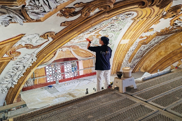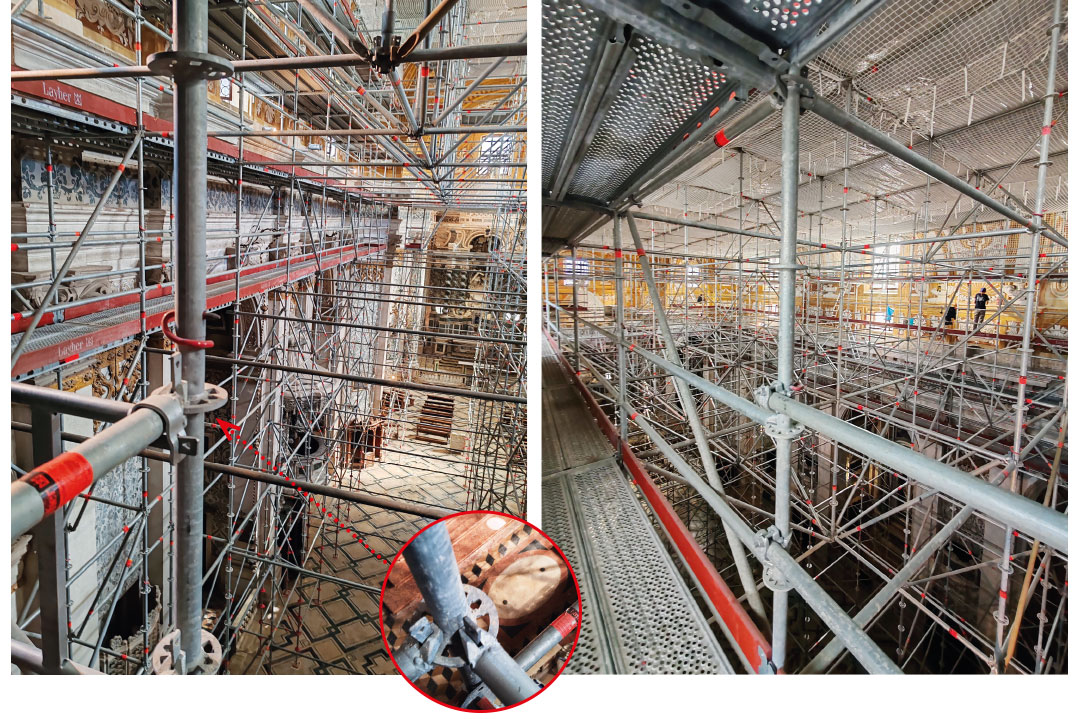 Come sottolinea Gloria Ballarin, Direttore di Cantiere Lithos Srl: "La forza del sistema multidirezionale Layher e ovviamente dell'attenta progettazione della sua messa in opera risiede nella possibilità di riuscire ad aggirare ostacoli come possono essere pulpiti, pilastri, colonne, o fregi che tipicamente si possono incontrare in un edificio di culto consentendo comunque di avvicinarcisi il più possibile così da lavorare in piena sicurezza e al tempo stesso in una posizione comunque idonea e consona all'esecuzione del restauro. Inoltre - prosegue - se una volta si lavorava con strutture provvisionali che avevano dimensioni molto strette, ora con i sistemi Layher possiamo avere travi che arrivano anche a 3 m di larghezza, vale a dire quindi che, sia il visitatore sia il restauratore riescono a trarne vantaggio, in quanto se il primo beneficia di poter vedere il monumento attraverso le strutture, il secondo riesce meglio a leggere quanto ha davanti, riuscendo a capire meglio le differenze cromatiche e le differenze delle varie superfici, così da ricavarne un risultato migliore a livello di interventi. Non solo - sottolinea Ballarin - il ponteggio montato in questa chiesa ha consentito di creare un unico piano di calpestio sulla sommità grazie al quale è stato possibile affrontare gli interventi sul soffitto, in cui oltre al restauro degli affreschi e degli stucchi, sono stati inseriti anche dei trefoli in fibra di basalto e malta a cucitura delle fessurazioni. Poter avere un'unica superficie dove lavorare e lavorare contemporaneamente guardando e calibrando gli interventi sull'intera aula è qualcosa di eccezionale. Per di più senza nessuna possibilità di inciampo grazie alla modularità e alla flessibilità dei sistemi Layher".