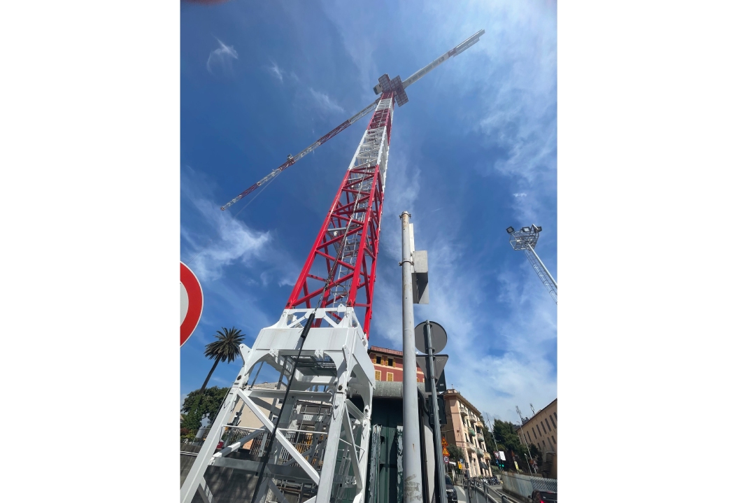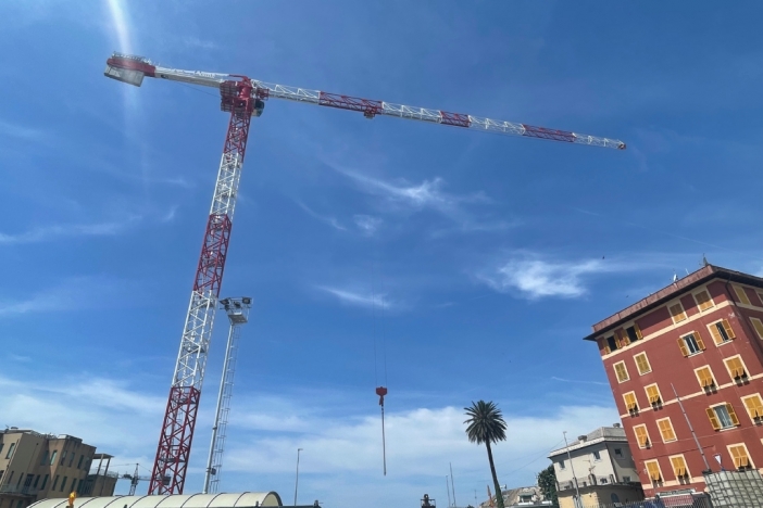 Una gru a torre Potain MDT 389 L16 è ora operativa presso il cantiere del Nuovo Ospedale Gaslini di Genova, in Italia.
