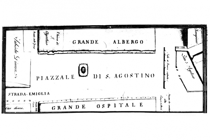 L'assunto è che le vicende storiche non costituiscano un semplice sfondo, ma agiscano come motori di trasformazione dello spazio urbano: mutando assetti politici, pratiche assistenziali e dispositivi di rappresentanza; cambiano la dimensione, l'uso e la percezione della piazza, nonché la sua relazione di reciprocità con gli edifici che la delimitano. L'analisi segue il filo delle trasformazioni, mettendo in relazione la matrice infrastrutturale della Via Emilia e la permanenza agostiniana con la stagione riformatrice estense, per mostrare come lo spazio urbano abbia continuamente rinegoziato misura, margini e centralità. In questo processo, forma architettonica e uso non si susseguono ma si co-determinano: pratiche di culto, assistenza, sanità e cultura hanno via via richiesto modifiche ai corpi di fabbrica, ai fronti e alle soglie, ridefinendo la scena urbana. Allo stesso tempo, allestimenti, restauri e sottrazioni - dalle demolizioni ai risanamenti - hanno riscritto l'immagine pubblica del luogo, orientandone la percezione collettiva. Ne emerge come la piazza, pur non essendo né foro né agorà in senso classico, abbia assunto nel tempo una configurazione ibrida, capace di accomodare funzioni diverse nel tempo. Più che porre un interrogativo, questa lettura storica alimenta un momento di riflessione - avviato già dalla fine del Novecento e ancora in corso - sull'equilibrio dell'uso di Sant'Agostino e del suo sistema edilizio. Una riflessione che incrocia temi di conservazione e rifunzionalizzazione, rapporto tra monumentalità e uso civico, accessibilità e sostenibilità gestionale, fino al ruolo del progetto contemporaneo nei contesti storici. In questo quadro, le stratificazioni non sono solo eredità da tutelare, ma dispositivi interpretativi che orientano le scelte presenti, misurando la continuità d'uso con la riconoscibilità formale del luogo (Figura 1).