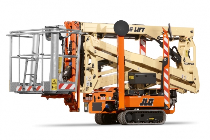 • X17JP, piattaforma cingolata compatta, perfetta per lavori in ambienti urbani, interni di edifici o aree con accessi limitati, è dotata di stabilizzatori autolivellanti, capacità del cestello fino a 230 kg, basse emissioni e rumore ridotto. I cingoli motorizzati sono progettati per una facile manovrabilità anche su terreni irregolari.