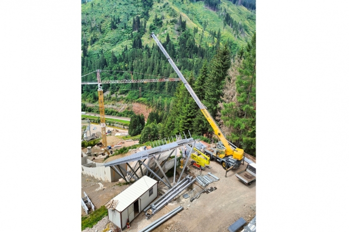 Se infatti per il montaggio della carpenteria metallica nelle aree più basse è stato possibile utilizzare delle classiche piattaforme semoventi, per le zone delle piste di lancio ubicate a un'altezza più elevata si è reso necessario l'impiego di una "piattaforma ragno". "Seppur la nostra società disponga di un parco macchine di dimensioni molto importanti, le peculiarità del cantiere ci hanno obbligato a utilizzare una tipologia di mezzo molto particolare. Le sue caratteristiche dovevano essere essenzialmente tre: peso e ingombro contenuti per essere sollevato con facilità e posizionato nell'area di utilizzo, presenza di cingoli per adattarsi alla conformazione del terreno e altezza di lavoro e sbraccio importanti", ha proseguito Patroni. "Questo è il motivo per cui abbiamo deciso di avvalerci della collaborazione di una società specializzata nel noleggio di piattaforme aeree, in grado di individuare e fornirci la migliore soluzione possibile rispetto alle nostre esigenze".