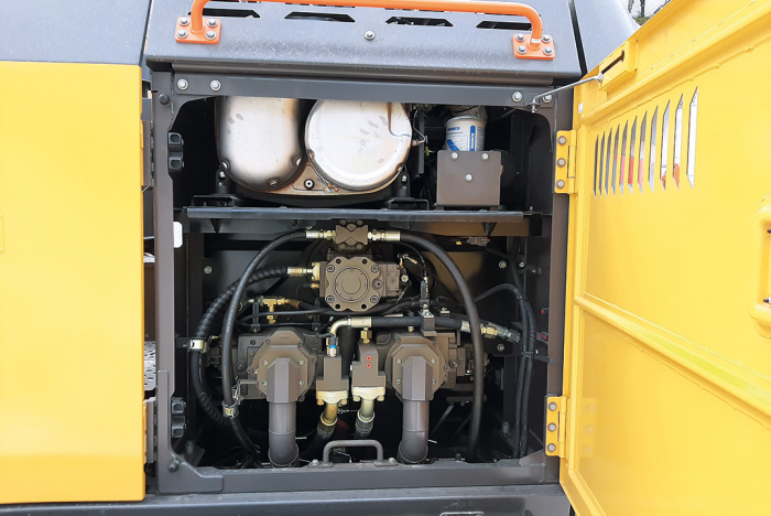 Sempre sul lato sinistro troviamo il vano pompe, l'EC950F è dotato di 3 pompe del circuito idraulico due standard e una addizionale che può essere utilizzata e gestita per indirizzare il flusso dove c'è bisogno. "In un discorso di produttività di scavo e carico, ad esempio, posso indirizzare la pompa alla rotazione del braccio," precisa Misani. La grande stabilità della macchina è assicurata dal contrappeso fisso, è disponibile anche un contrappeso smontabile idraulicamente, che sia standard o idraulico il peso rimane 16100 Kg.