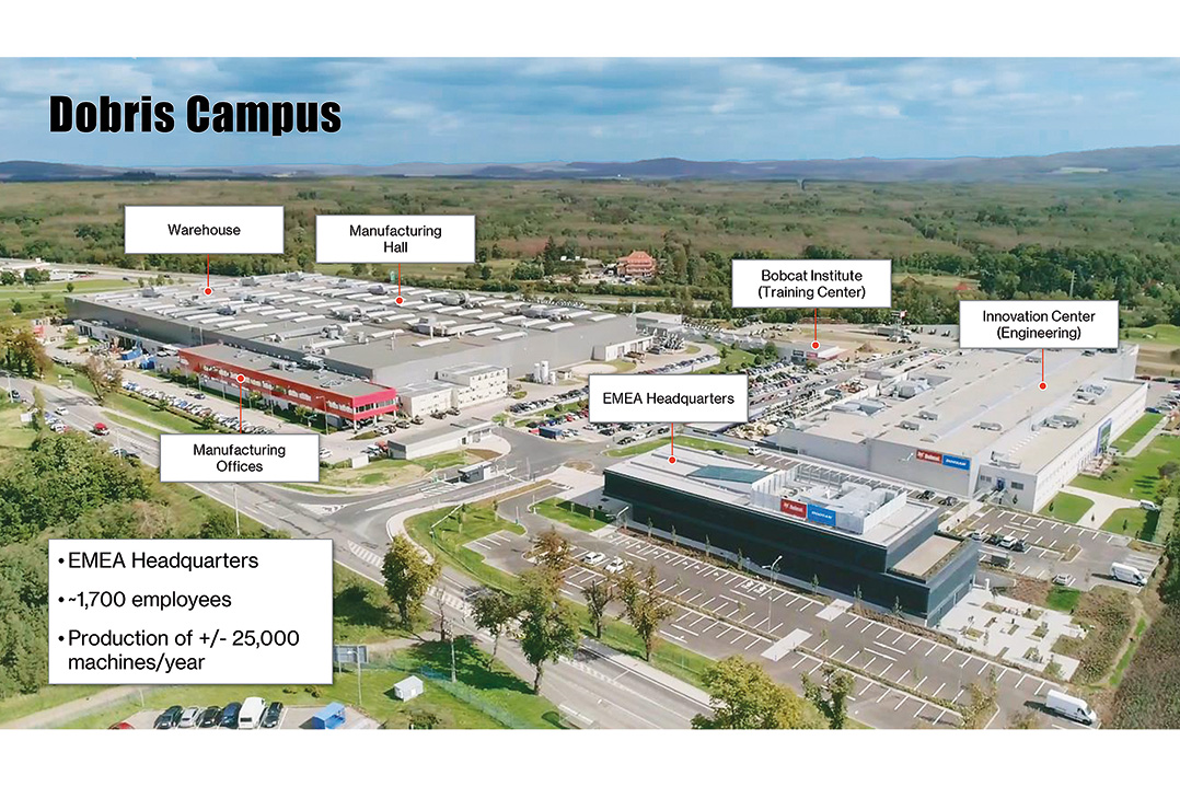 La struttura comprende: uno stabilimento in grado di produrre oltre 25.000 macchine all'anno, in particolare pale cingolate compatte, pale gommate compatte e miniescavatori destinati sia ai clienti EMEA sia all'esportazione in altri paesi del mondo, con predilezione per America e Asia; l'Innovation Center, in cui ingegneri e progettisti testano, innovano e sviluppano costantemente nuovi prodotti e tecnologie; il Bobcat Institute, ossia il Training Center in cui viene erogata formazione e assistenza a concessionari, clienti e operatori su tutta quella che è l'offerta Bobcat, e infine l'edificio uffici, dove risiedono il team dirigenziale dell'azienda, insieme a tutti gli altri reparti per un totale di oltre 1.700 dipendenti.