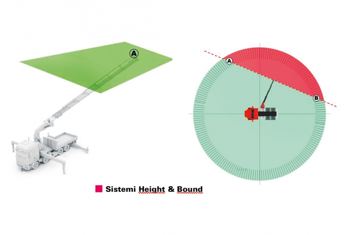 A completare questo pacchetto di tecnologie avanzate ci sono i sistemi Height & Bound. Con Height, l'operatore può impostare un'altezza massima da non superare, configurabile facilmente dal radiocomando portando il braccio al livello desiderato o inserendo manualmente i metri. Raggiunto il limite, la gru interrompe automaticamente tutti i movimenti di sollevamento ed estensione, evitando urti con strutture sovrastanti. Bound, invece, sfrutta i sensori integrati per creare una sorta di "muro virtuale": impostando due punti, l'operatore definisce un confine oltre il quale il braccio non può andare, ottenendo un controllo ancora più rigoroso dello spazio di lavoro.