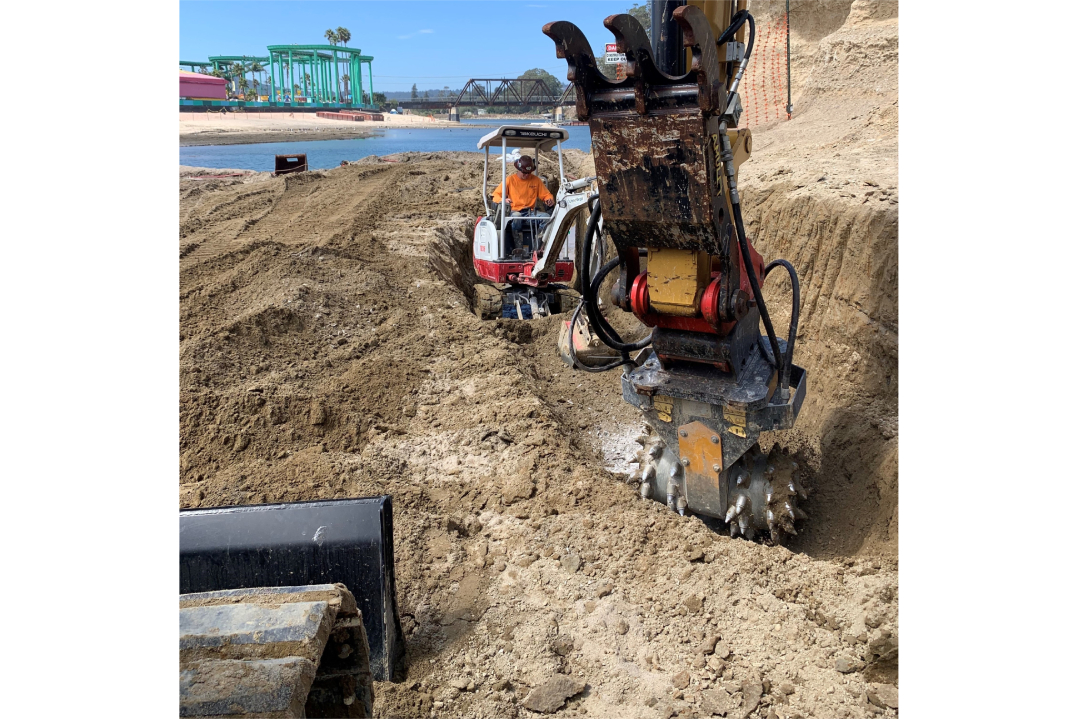 In California, l'utilizzo di una fresa a tamburo per allargare le sponde di un fiume ha consentito di ottenere pareti più piatte e fondali più lisci. Usando la fresa MB-R700, non è stato necessario utilizzare una benna da scavo o un martello per scavare la trincea, cosa che non avrebbe portato gli stessi risultati.