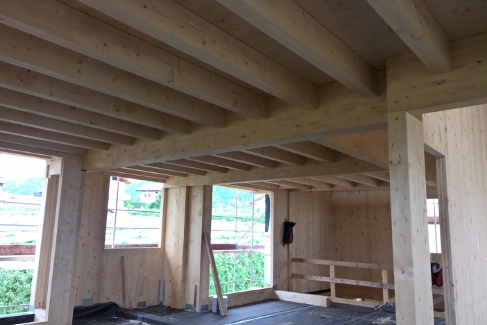 La struttura portante del soppalco, che concerne una delle due unità abitative, è stata realizzata in legno di abete con sistema a travi portanti e tavolato. L'orditura principale è in legno lamellare, mentre l'orditura secondaria è in abete bilama, l'impalcato è in tavole di abete, sempre di elevata qualità, con spessore nominale di 20 mm, così pure il tavolato grezzo in abete posato diagonalmente con funzione di controventatura del solaio.