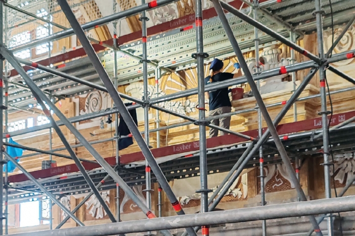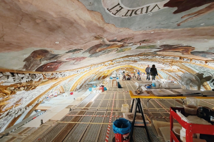 Come sottolinea Gloria Ballarin, Direttore di Cantiere Lithos Srl: "La forza del sistema multidirezionale Layher e ovviamente dell'attenta progettazione della sua messa in opera risiede nella possibilità di riuscire ad aggirare ostacoli come possono essere pulpiti, pilastri, colonne, o fregi che tipicamente si possono incontrare in un edificio di culto consentendo comunque di avvicinarcisi il più possibile così da lavorare in piena sicurezza e al tempo stesso in una posizione comunque idonea e consona all'esecuzione del restauro. Inoltre - prosegue - se una volta si lavorava con strutture provvisionali che avevano dimensioni molto strette, ora con i sistemi Layher possiamo avere travi che arrivano anche a 3 m di larghezza, vale a dire quindi che, sia il visitatore sia il restauratore riescono a trarne vantaggio, in quanto se il primo beneficia di poter vedere il monumento attraverso le strutture, il secondo riesce meglio a leggere quanto ha davanti, riuscendo a capire meglio le differenze cromatiche e le differenze delle varie superfici, così da ricavarne un risultato migliore a livello di interventi. Non solo - sottolinea Ballarin - il ponteggio montato in questa chiesa ha consentito di creare un unico piano di calpestio sulla sommità grazie al quale è stato possibile affrontare gli interventi sul soffitto, in cui oltre al restauro degli affreschi e degli stucchi, sono stati inseriti anche dei trefoli in fibra di basalto e malta a cucitura delle fessurazioni. Poter avere un'unica superficie dove lavorare e lavorare contemporaneamente guardando e calibrando gli interventi sull'intera aula è qualcosa di eccezionale. Per di più senza nessuna possibilità di inciampo grazie alla modularità e alla flessibilità dei sistemi Layher".