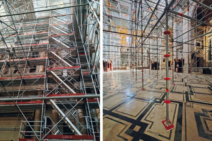 La possibilità di tenere aperta la chiesa, dall'inizio del cantiere, quindi ottobre 2024 fino al 30 aprile 2026, data prevista di fine lavori, è senz'altro un plus reso possibile dal sistema provvisionale Layher. Come ci spiega Andrea Piovesan, Sviluppo Tecnico Commerciale di Layher Spa: "Se avessimo affrontato questo cantiere quarant'anni fa, avremmo dovuto riempire il volume della chiesa di tubo e giunto, oggi invece abbiamo potuto sfruttare la tecnologia Layher per utilizzare un sesto in meno del materiale, che si traduce anche in un sesto in meno del peso che grava sul pavimento, un pavimento irregolare vista l'ovvia mancanza di fondazioni, ma soprattutto un pavimento che ha l'assoluta necessità di essere preservato trattandosi di un pavimento in pietra d'Istria realizzato con tecnica mista di intarsio e commesso e con inserti di verde alpi e, nelle parti più pregiate, di verde antico. Grazie al sistema multidirezionale Allround - prosegue Piovesan - caratterizzato dall'assenza di giunzioni a bullone, possiamo collegare tra loro, ad angolo retto, i diversi elementi, ma possiamo anche orientarli a piacimento, garantendo sempre la trasmissione ottimale dei carichi. Obiettivo primario per questo lavoro - specifica - era la realizzazione di un ponteggio che, all'interno della chiesa, fosse leggero e il meno invasivo possibile. Con l'utilizzo del nostro sistema Allround e l'ausilio di elementi Allround LW (Light Weight) abbiamo diminuito il peso proprio della struttura, aumentandone allo stesso tempo la portata, potendo lavorare con campate di lunghezza maggiore: una soluzione che ha permesso di garantire un'ottima accessibilità alla base, minimizzando gli appoggi a terra per ridurre appunto le interferenze alla fruizione della chiesa stessa. Se all'esterno è stato realizzato un ponteggio per intervenire sia sulle facciate sia parzialmente sulla copertura, con l'inserimento di una torre scala a rampe in alluminio per garantire un accesso comodo e sicuro ai diversi piani di lavoro - conclude Piovesan - nella parte interna la piattaforma per poter intervenire su affreschi e sui soffitti è supportata da soli appoggi laterali, mentre una torre centrale, insieme a lunghe campate trasversali, permette una maggiore lavorabilità sulle superfici oggetto di intervento e, allo stesso tempo, riduce l'impatto visivo della struttura. Struttura che, se esternamente raggiunge un'altezza di 38 metri, internamente presenta altezze che variano dai 16 metri nel perimetro della navata centrale ai 24 nella zona centrale".
